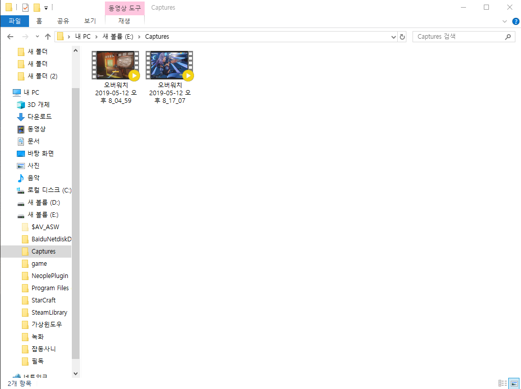 폴더 위치 변경 방법은 동영상이 저장되는 Captures 폴더를 잘라내기 혹은 ctrl+x 하여 원하는 곳에 붙여 넣기를 하면 된다.