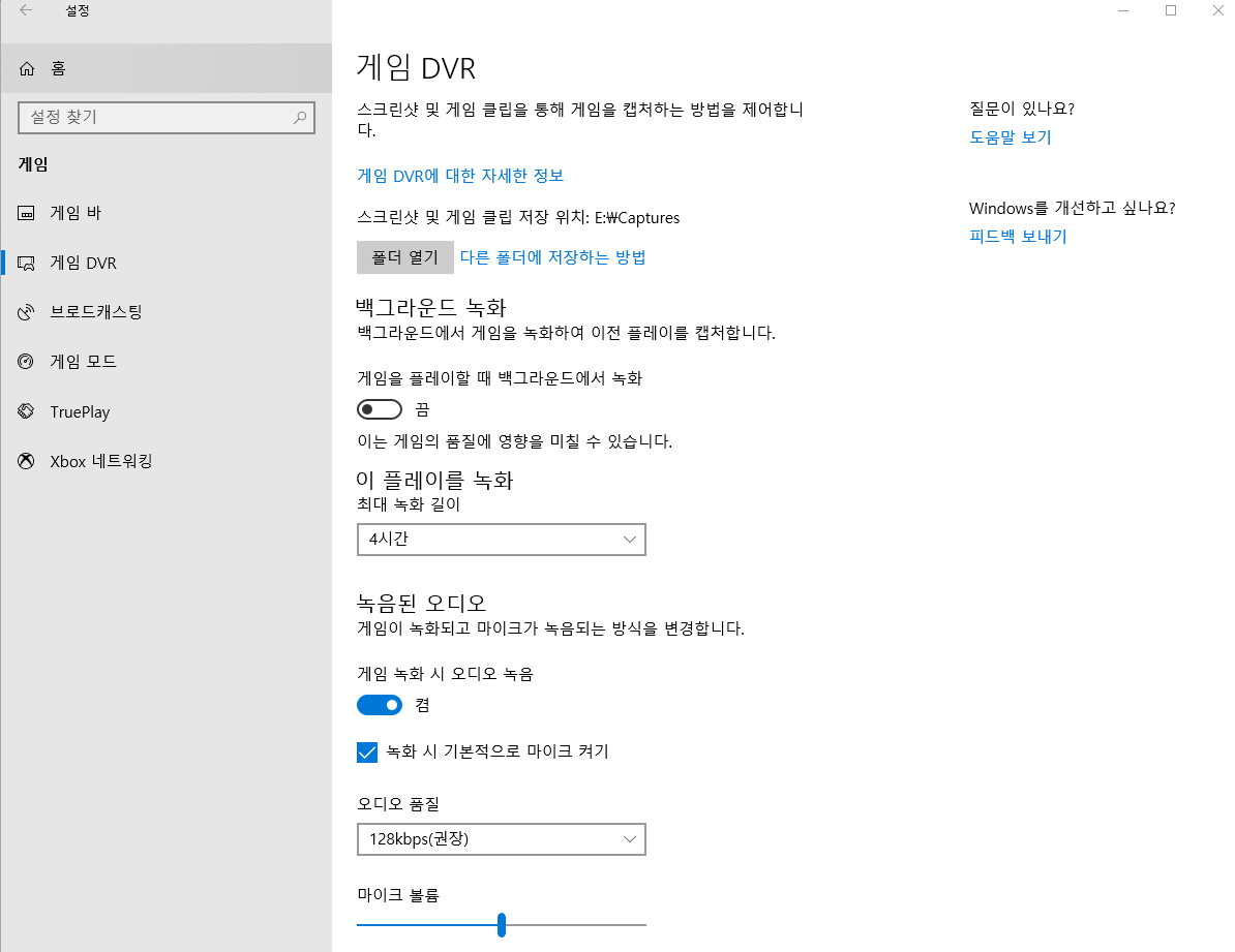 좌측의 메뉴들 중에서 게임 DVR로 들어가면 우리가 필요한 영상 녹화에 대한 설정 및 옵션들이 나온다.