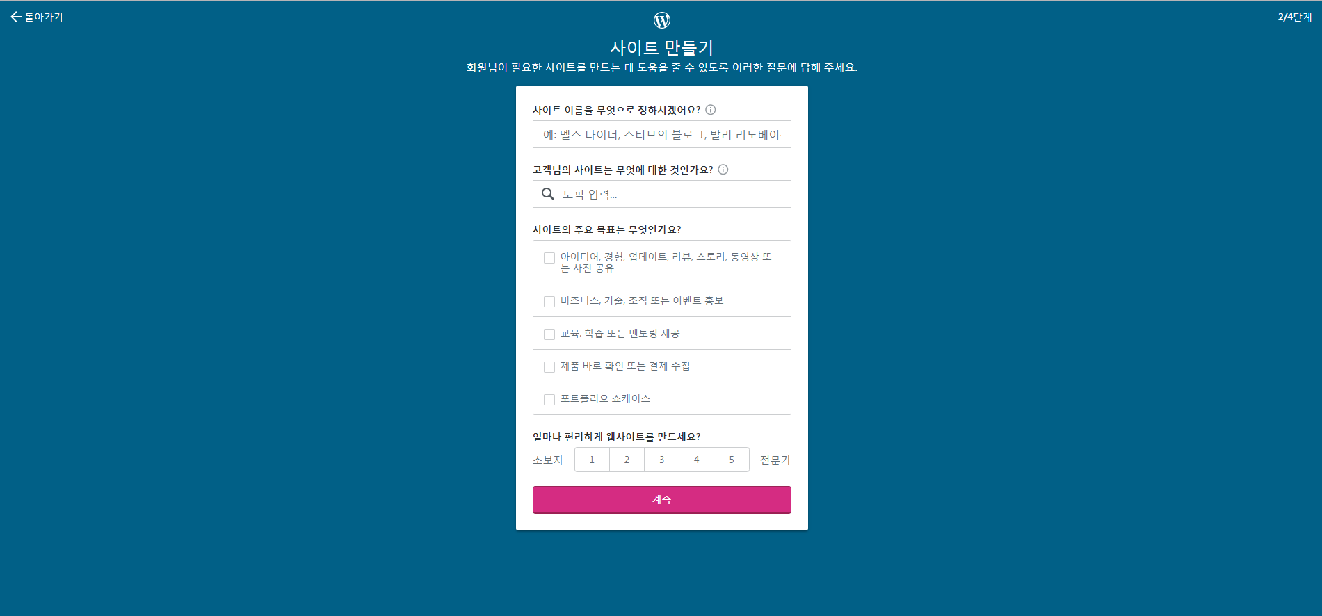 그 다음 단계로 사이트 이름이나 주제 목적등을 설정하는 화면이 나온다.