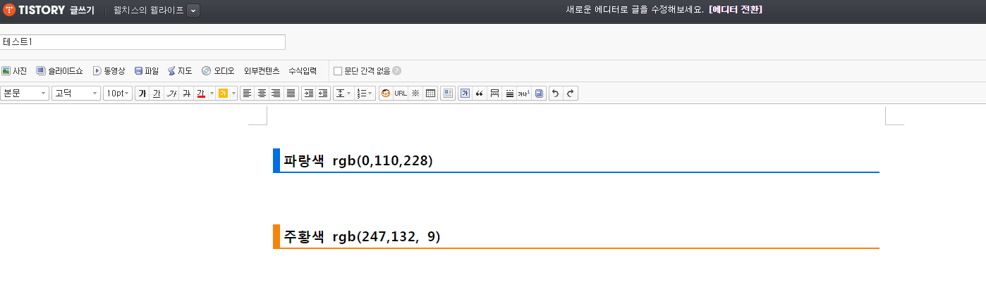 티스토리 특성상 글을 길게 쓰는 경우가 많기 때문에 분위기 전환이나 단락 구분등으로 필요한 소제목 서식 만들기입니다.