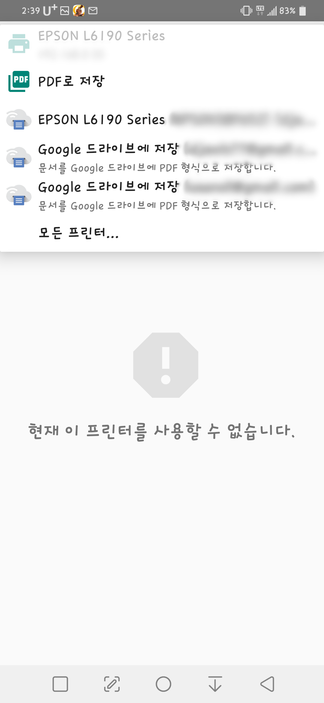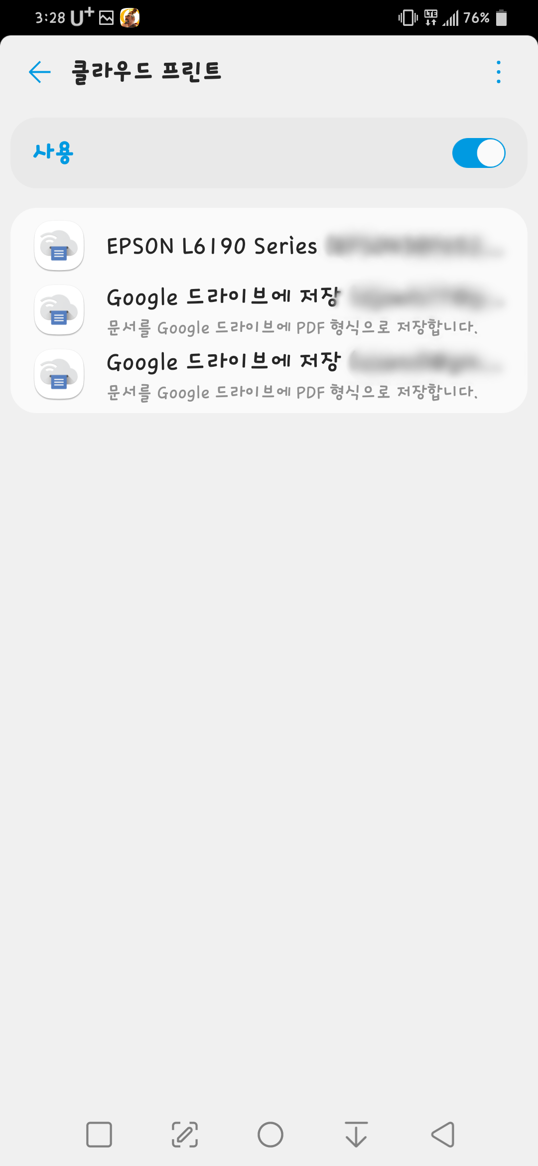 클라우드 프린트를 클릭해보면 스마트폰에 연동된 구글 계정에 따라 구글 드라이브 저장과 구글 클라우드 프린트에서 추가한 프린터가 보입니다.