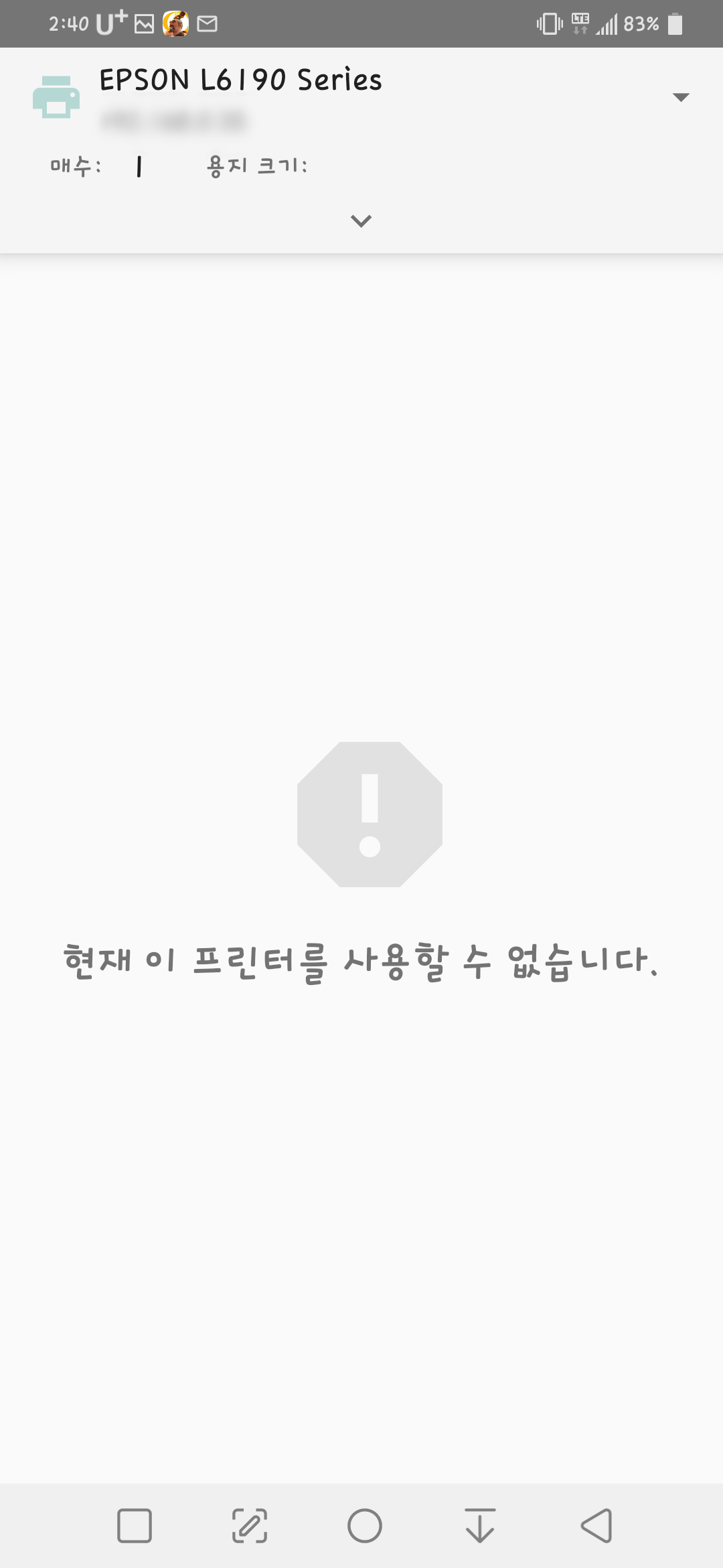 그래서 제 화면에도 현재 이 프린터를 사용할 수 없다고 나오는데요 와이파이가 켜져있지 않기 때문입니다.