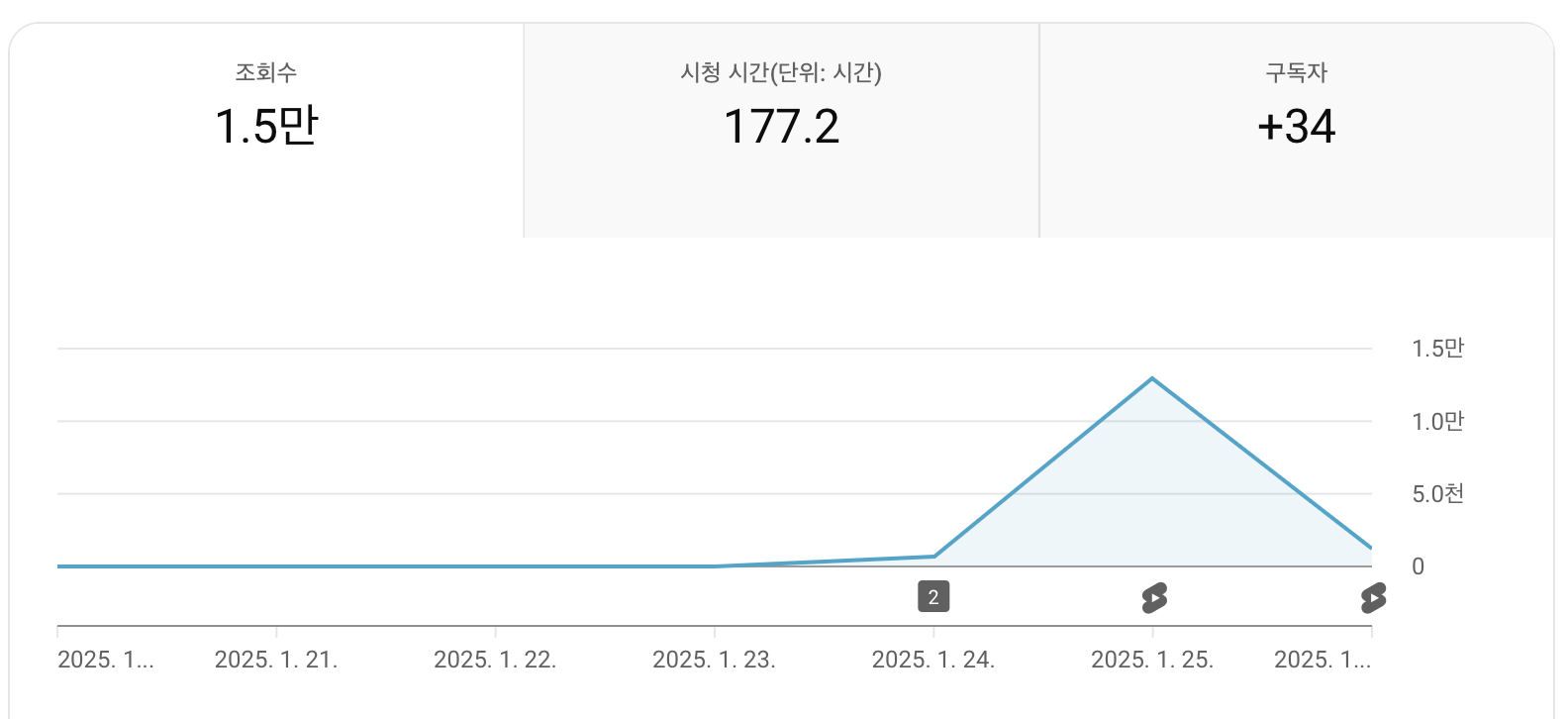 3일 동안의 성적은 1.5만의 조회수와 구독자 34명이었습니다.